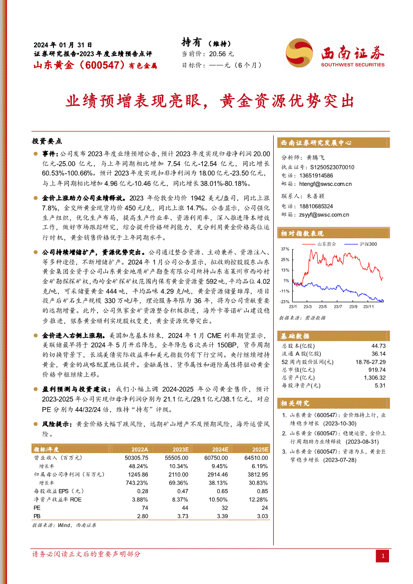 山东黄金:西南证券-山东黄金-600547-业绩预增表现亮眼,黄金资源优势突出-240131
