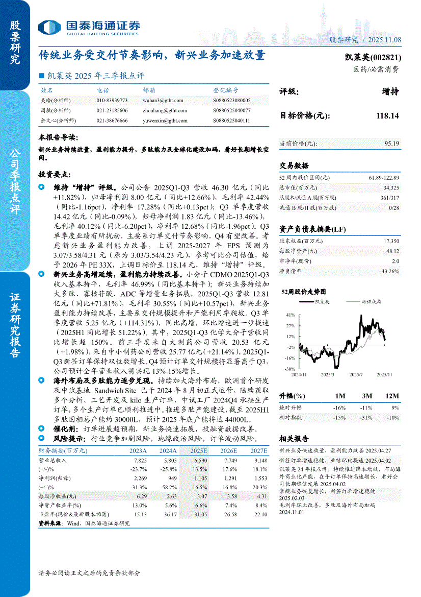 凯莱英:国泰海通证券-凯莱英-002821-2025年三季报点评:传统业务受交付节奏影响,新兴业务加速放量-251108