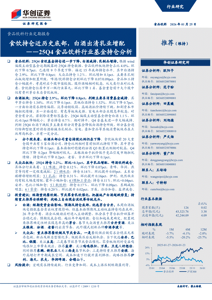 食品饮料行业:华创证券-食品饮料行业定期报告:食饮持仓近历史底部,白酒出清乳业增配——25Q4食品饮料行业基金持仓分析-260125