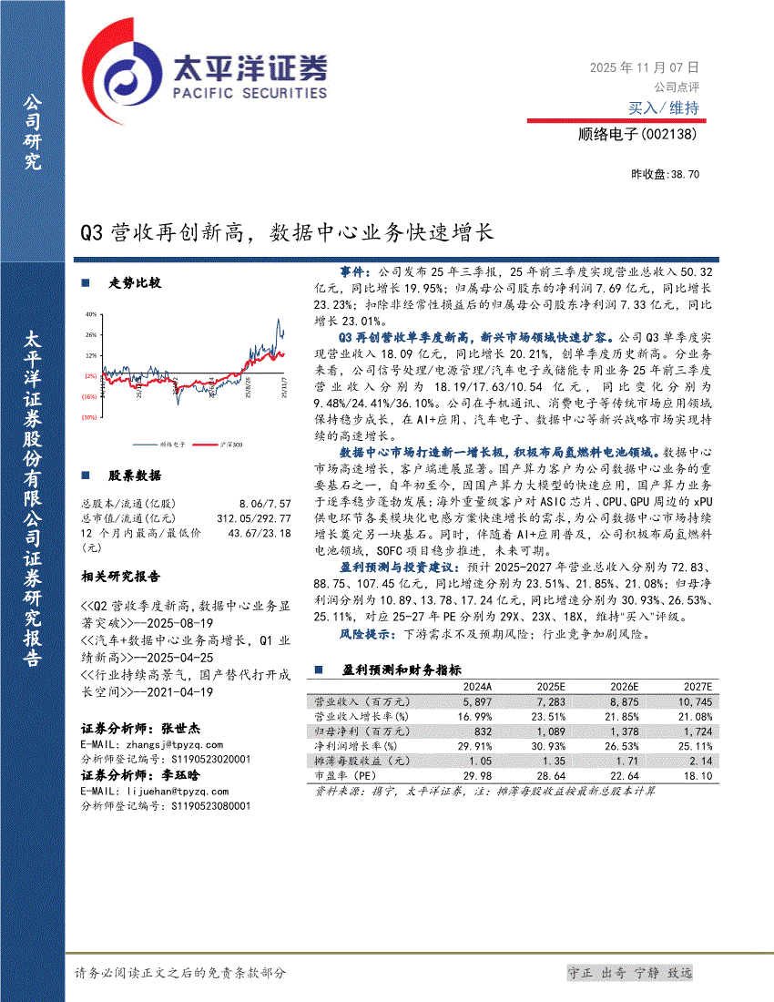 顺络电子:太平洋证券-顺络电子-002138-Q3营收再创新高,数据中心业务快速增长-251107