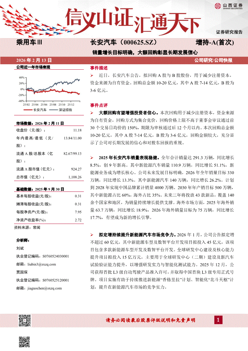 长安汽车:山西证券-长安汽车-000625-销量增长目标明确,大额回购彰显长期发展信心-260213