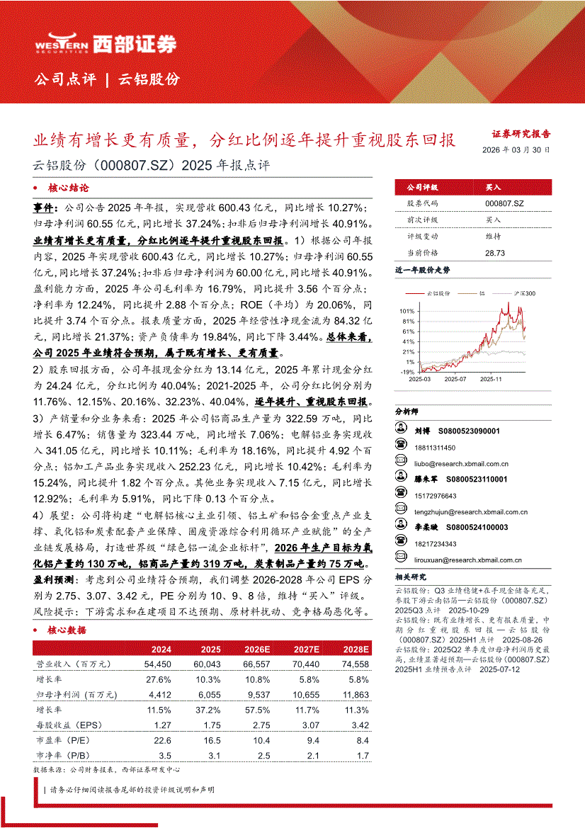 云铝股份:西部证券-云铝股份-000807-2025年报点评:业绩有增长更有质量,分红比例逐年提升重视股东回报-260330