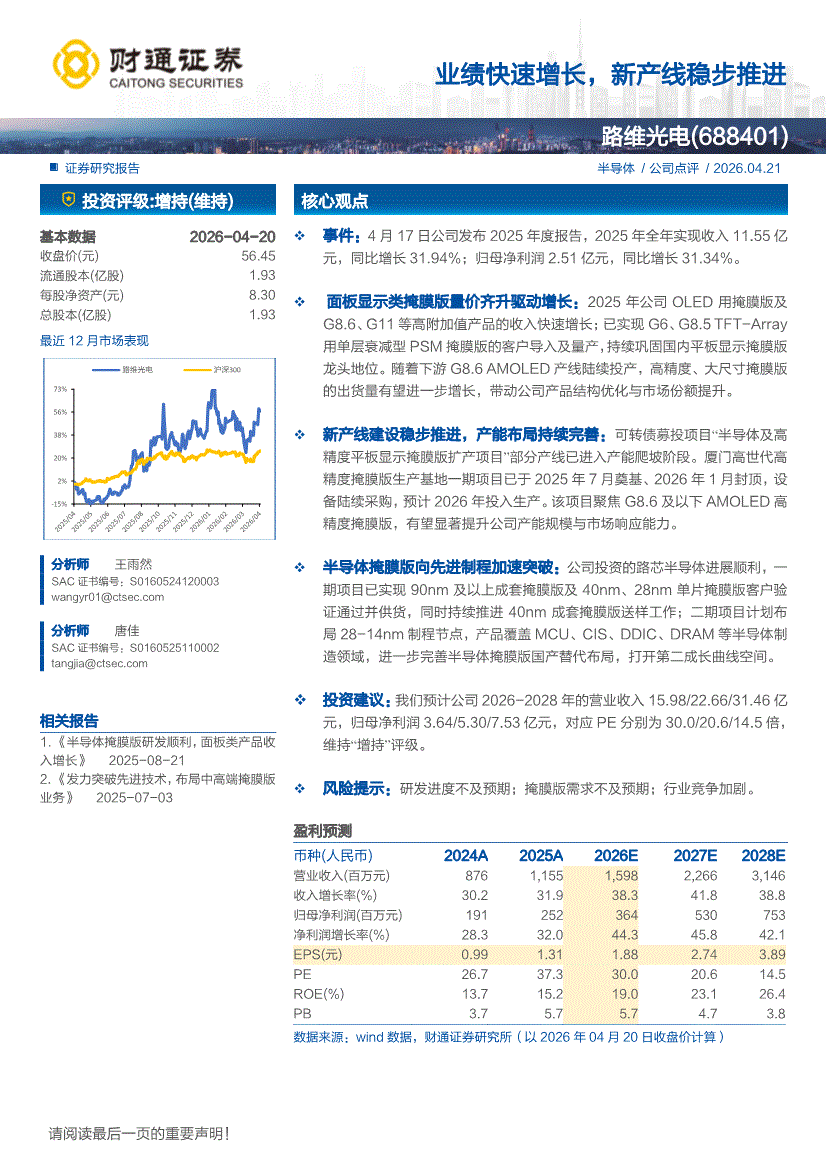 财通证券-路维光电-688401-业绩快速增长,新产线稳步推进-260421
