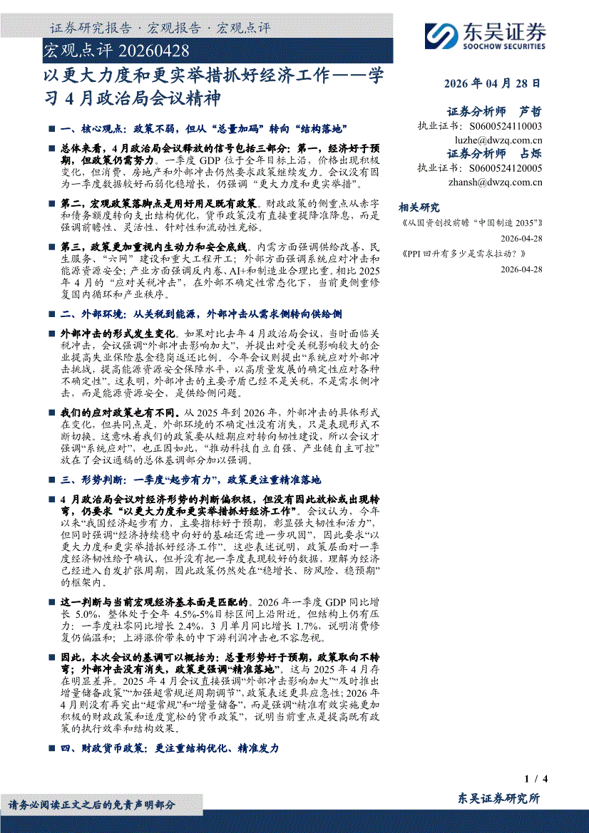 东吴证券-宏观点评:以更大力度和更实举措抓好经济工作——学习4月政治局会议精神-260428