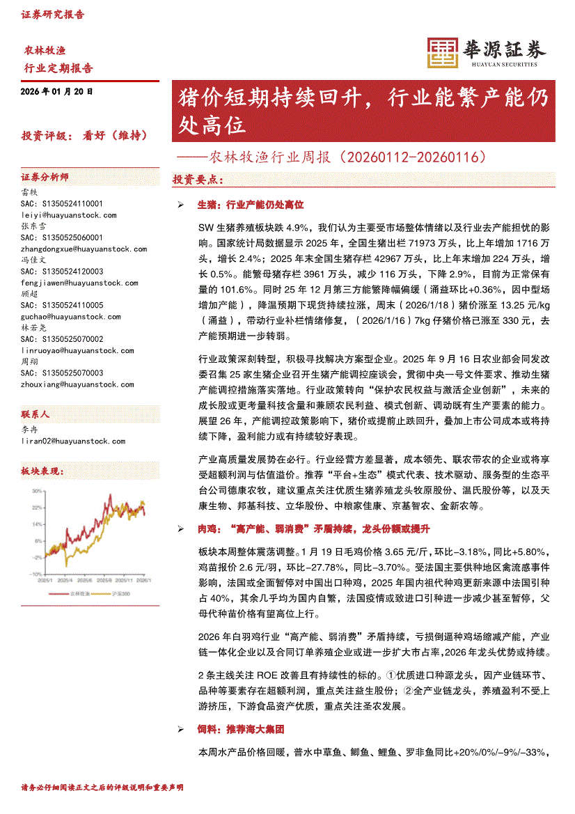 农林牧渔行业:华源证券-农林牧渔行业周报:猪价短期持续回升,行业能繁产能仍处高位-260120