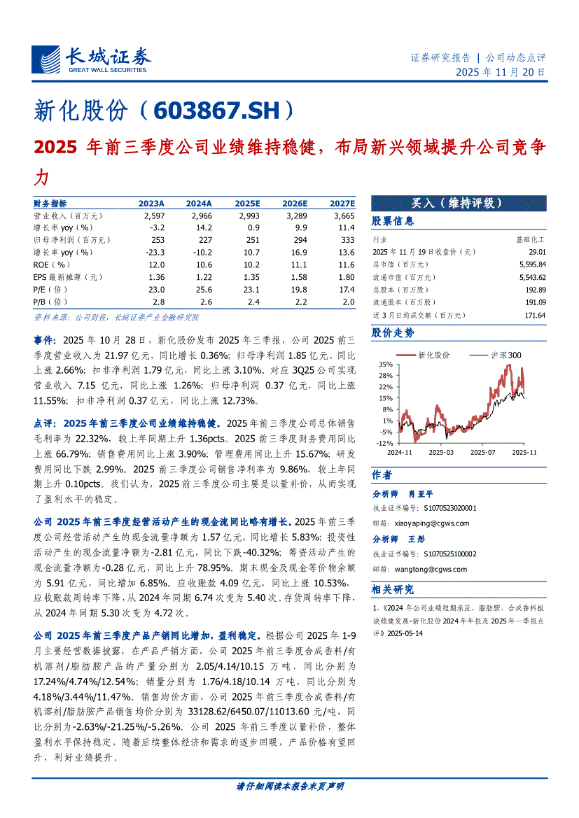 新化股份:长城证券-新化股份-603867-2025年前三季度公司业绩维持稳健,布局新兴领域提升公司竞争力-251120