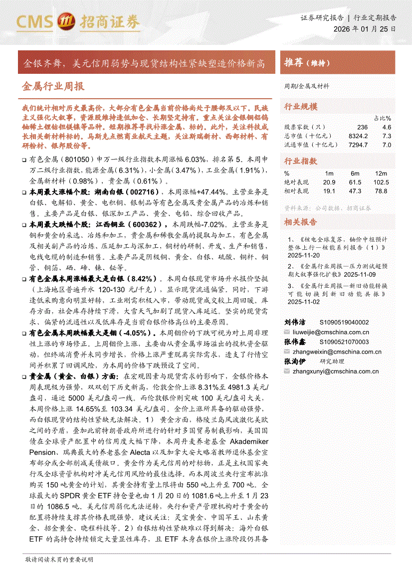 金属行业:招商证券-金属行业周报:金银齐舞,美元信用弱势与现货结构性紧缺塑造价格新高-260125