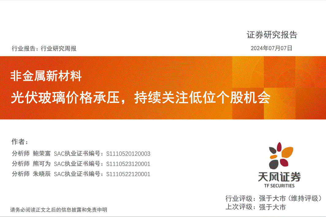 非金属新材料行业:天风证券-非金属新材料行业研究周报:光伏玻璃价格承压,持续关注低位个股机会-240707