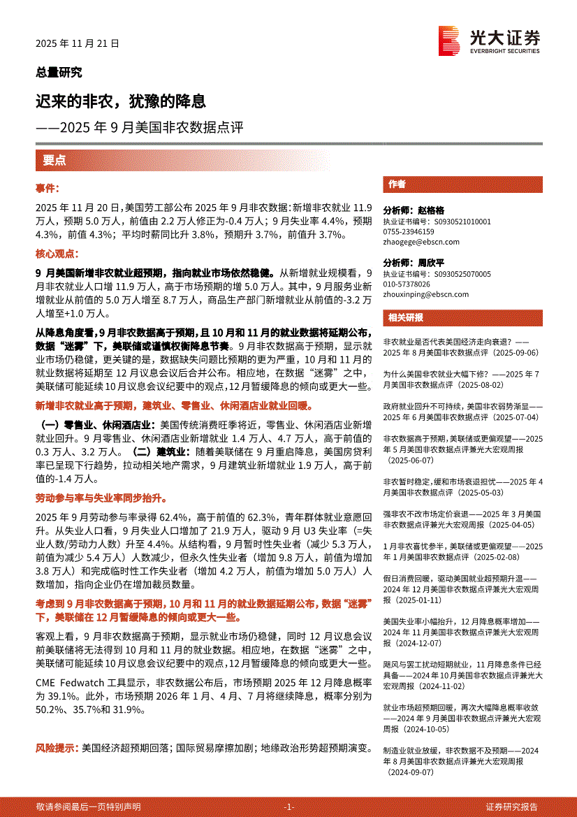 光大证券-2025年9月美国非农数据点评:迟来的非农,犹豫的降息-251121