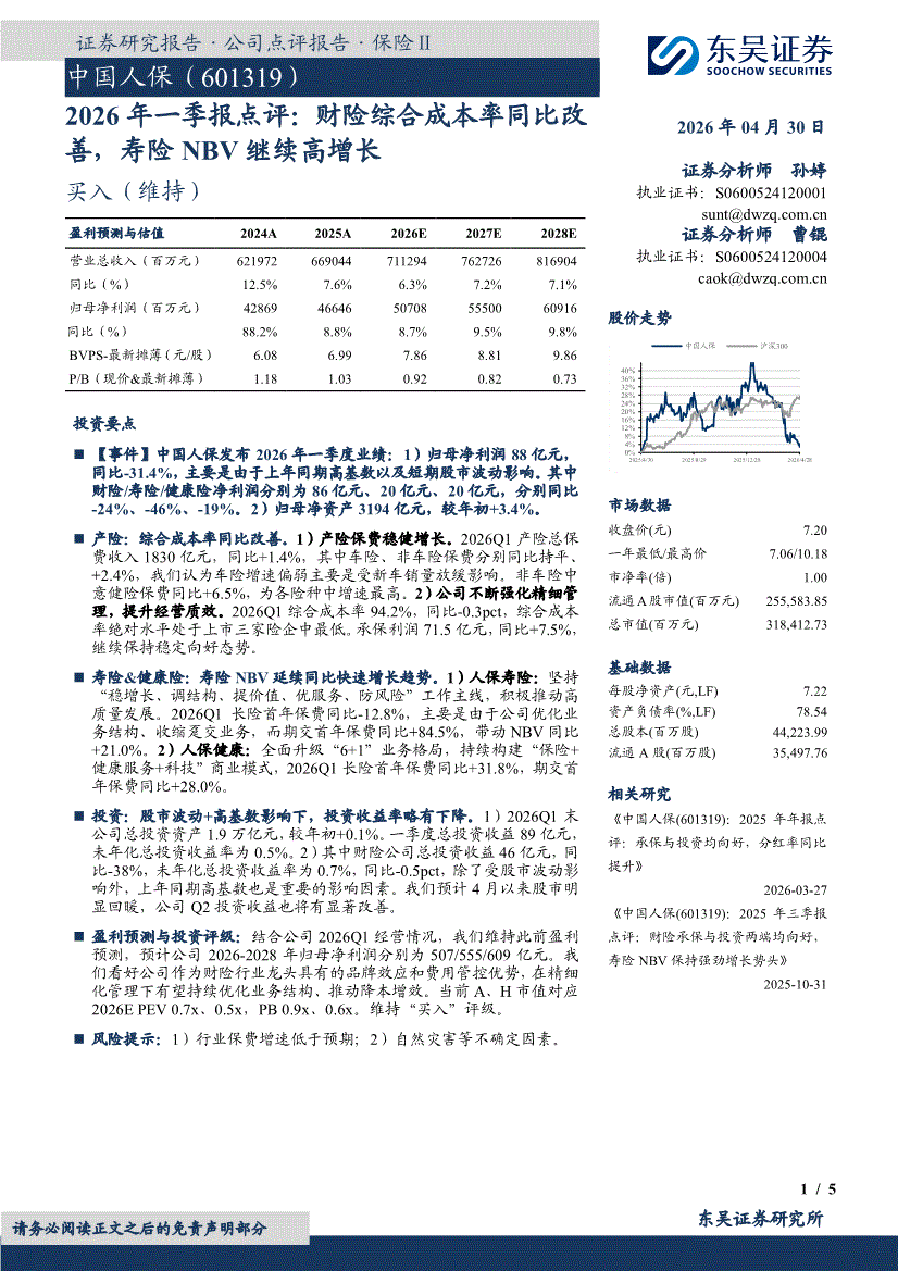 中国人保:东吴证券-中国人保-601319-2026年一季报点评:财险综合成本率同比改善,寿险NBV继续高增长-260430
