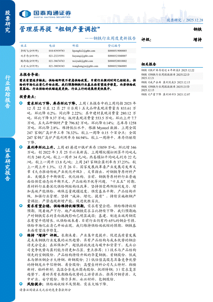 钢铁行业:国泰海通证券-钢铁行业周度更新报告:管理层再提“粗钢产量调控”-251228