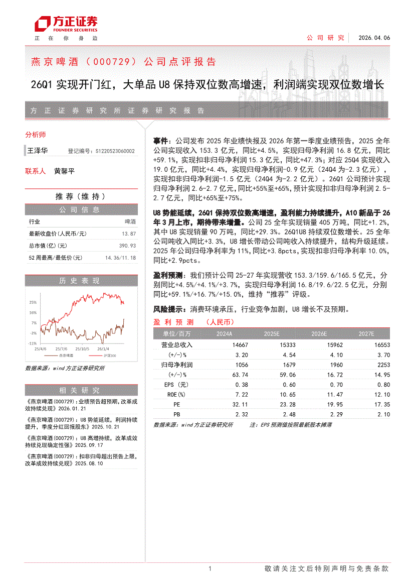 燕京啤酒:方正证券-燕京啤酒-000729-公司点评报告:26Q1实现开门红,大单品U8保持双位数高增速,利润端实现双位数增长-260406