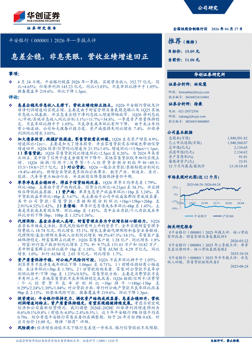 平安银行:华创证券-平安银行-000001-2026年一季报点评:息差企稳,非息亮眼,营收业绩增速回正-260427