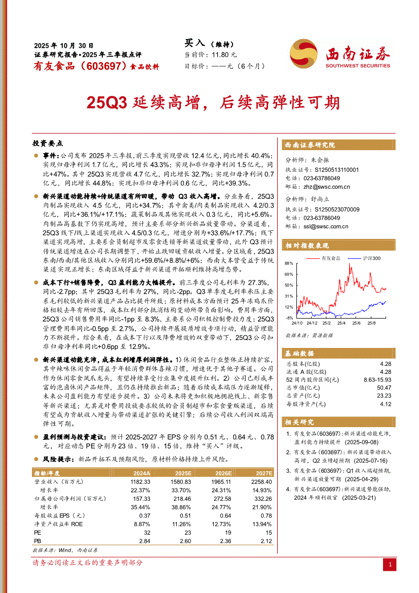 有友食品:西南证券-有友食品-603697-25Q3延续高增,后续高弹性可期-251030