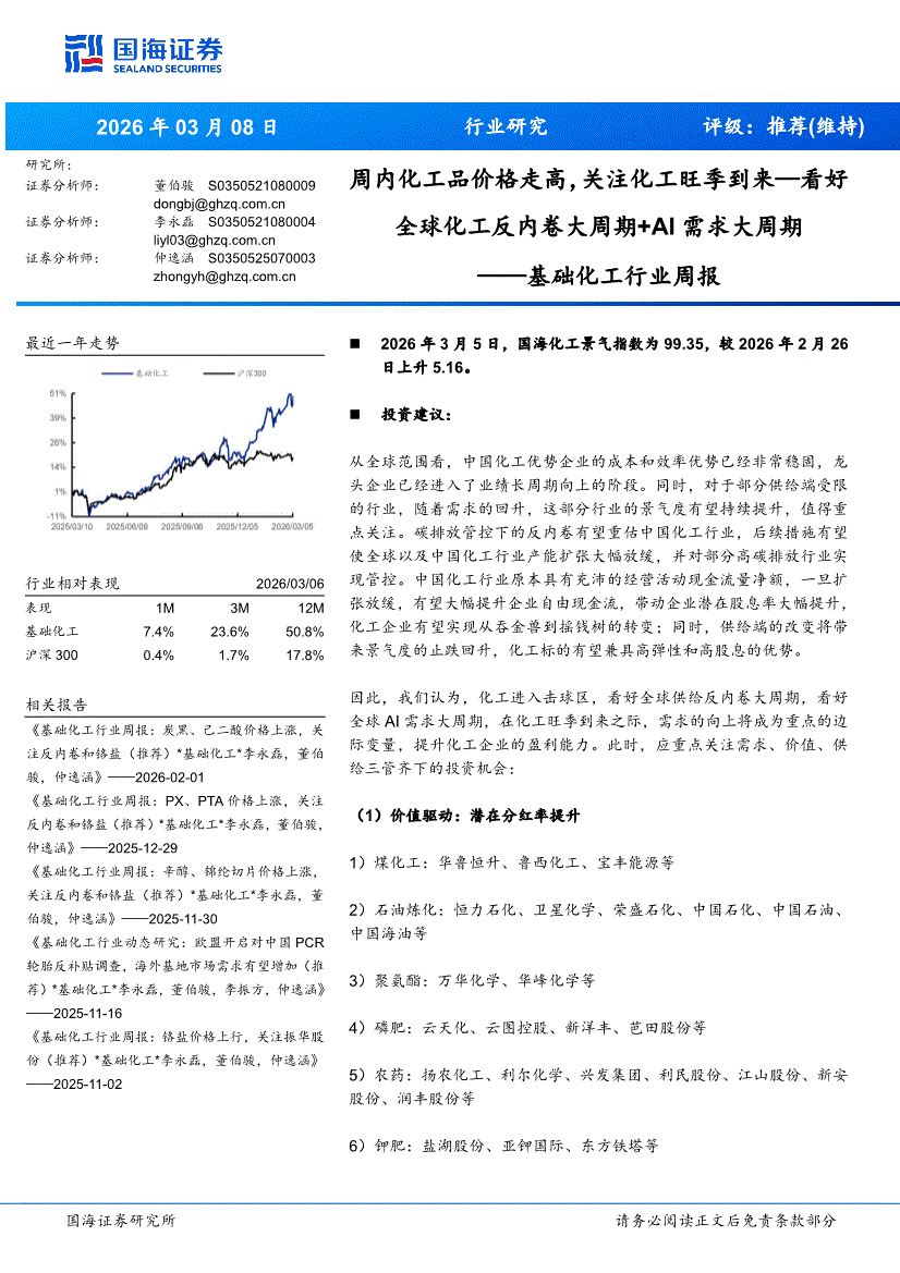 国海证券-基础化工行业周报:周内化工品价格走高,关注化工旺季到来—看好全球化工反内卷大周期+AI需求大周期-260308
