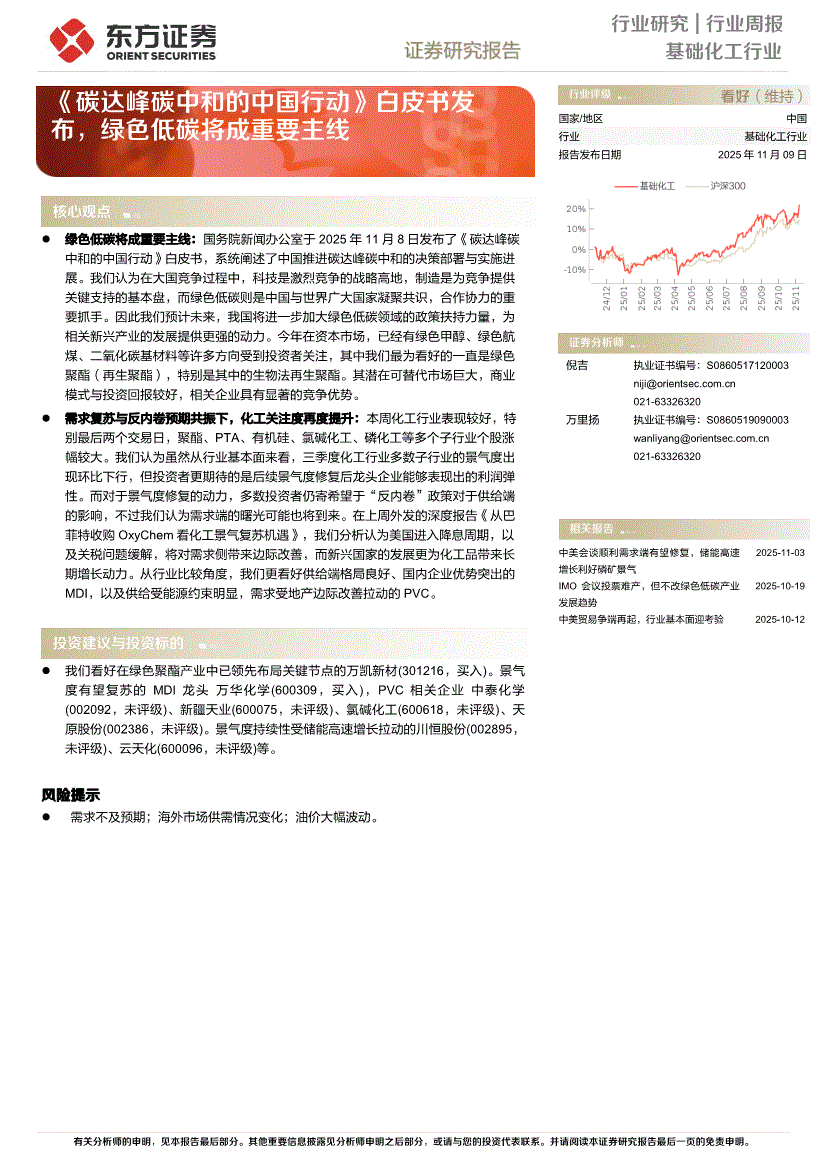 基础化工行业:东方证券-基础化工行业周报:《碳达峰碳中和的中国行动》白皮书发布,绿色低碳将成重要主线-251109