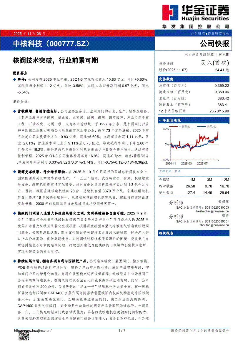 中核科技:华金证券-中核科技-000777-核阀技术突破,行业前景可期-251108