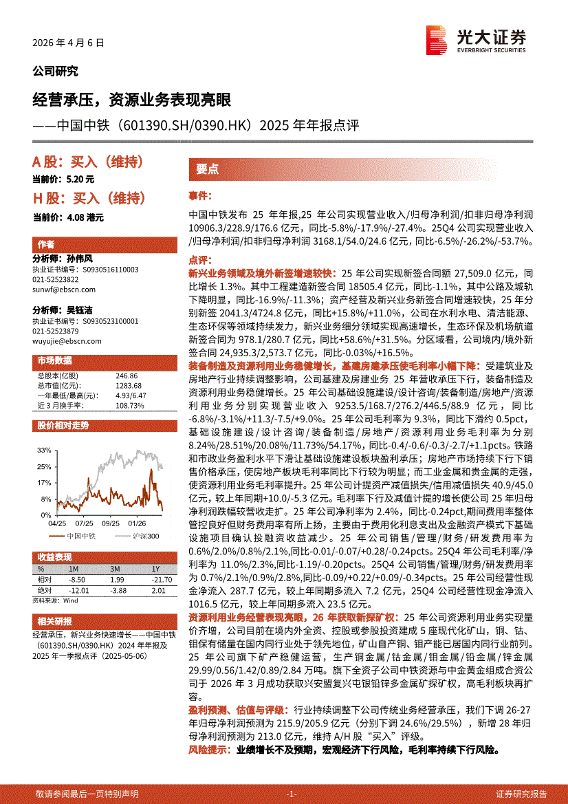 中国中铁:光大证券-中国中铁-601390-2025年年报点评:经营承压,资源业务表现亮眼-260406