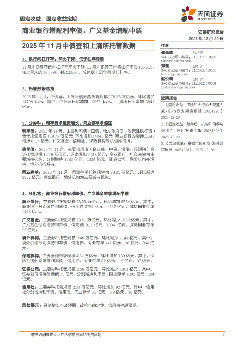 天风证券-2025年11月中债登和上清所托管数据:商业银行增配利率债,广义基金增配中票-251229