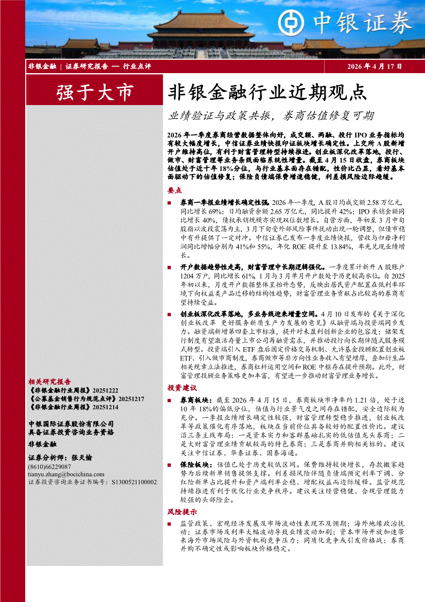 非银金融行业:中银国际-非银金融行业近期观点:业绩验证与政策共振,券商估值修复可期-260417