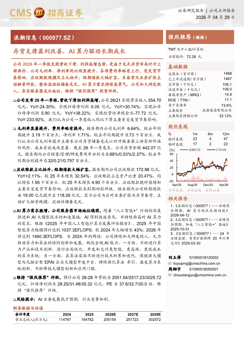 浪潮信息:招商证券-浪潮信息-000977-存货支撑盈利改善,AI算力驱动长期成长-260429