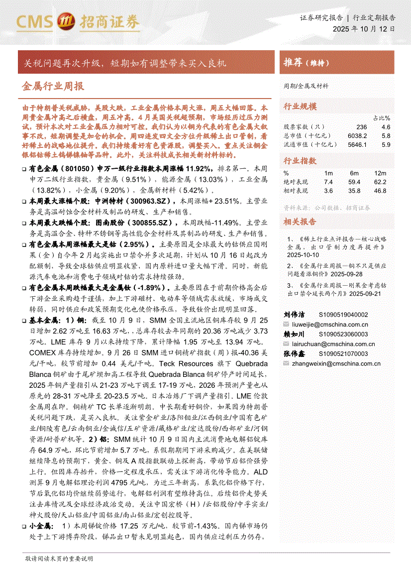 金属行业:招商证券-金属行业周报:关税问题再次升级,短期如有调整带来买入良机-251012