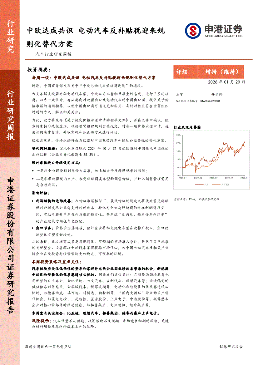 汽车行业:申港证券-汽车行业研究周报:中欧达成共识,电动汽车反补贴税迎来规则化替代方案-260120