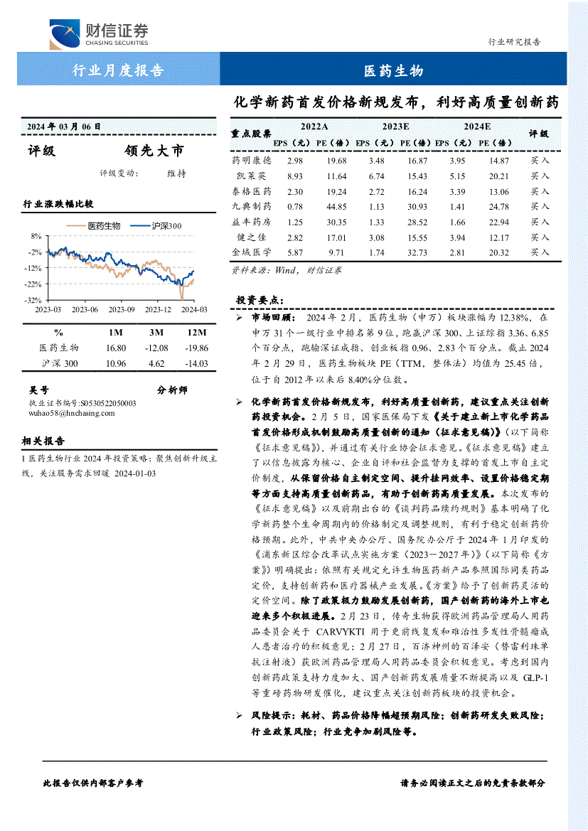 医药生物行业:财信证券-医药生物行业月度报告:化学新药首发价格新规发布,利好高质量创新药-240306