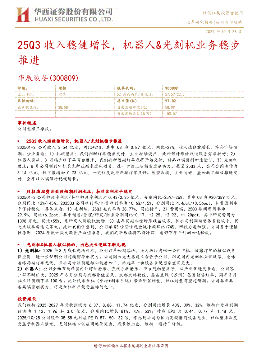 华辰装备:华西证券-华辰装备-300809-25Q3收入稳健增长,机器人&光刻机业务稳步推进-251028
