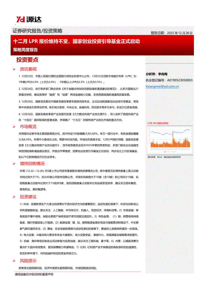 源达信息-策略周度报告:十二月LPR报价维持不变,国家创业投资引导基金正式启动-251226