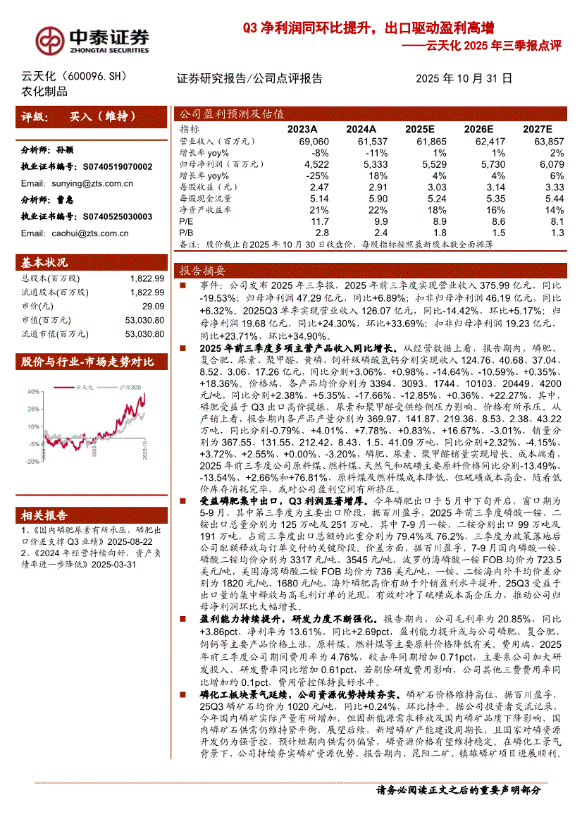 云天化:中泰证券-云天化-600096-2025年三季报点评:Q3净利润同环比提升,出口驱动盈利高增-251031