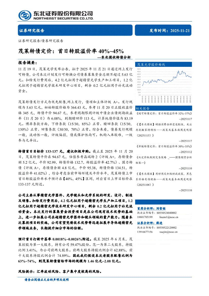 东北证券-固收转债分析:茂莱转债定价,首日转股溢价率40%~45%-251121
