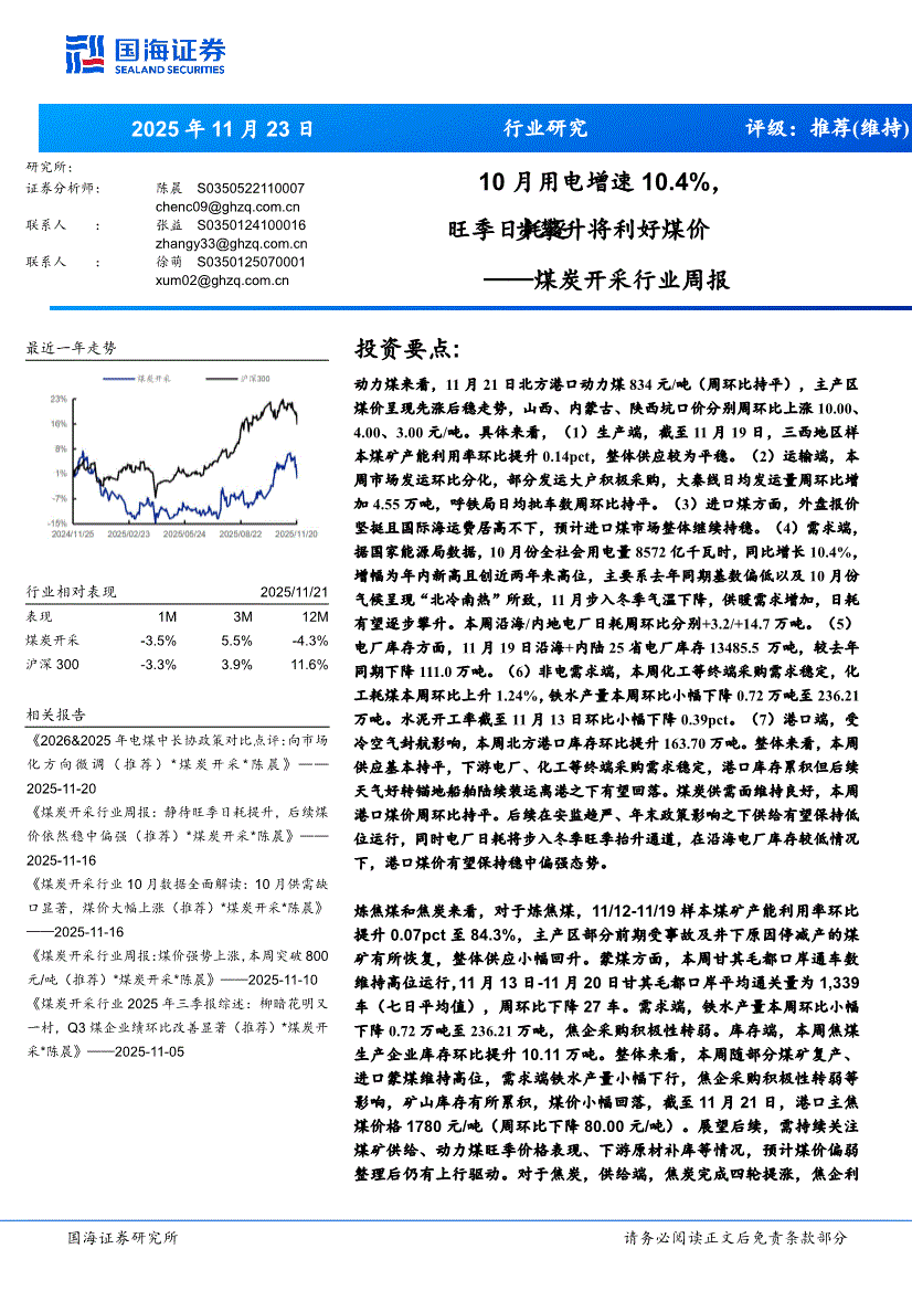 煤炭开采行业:国海证券-煤炭开采行业周报:10月用电增速10.4%,旺季日耗逐步攀升将利好煤价-251123