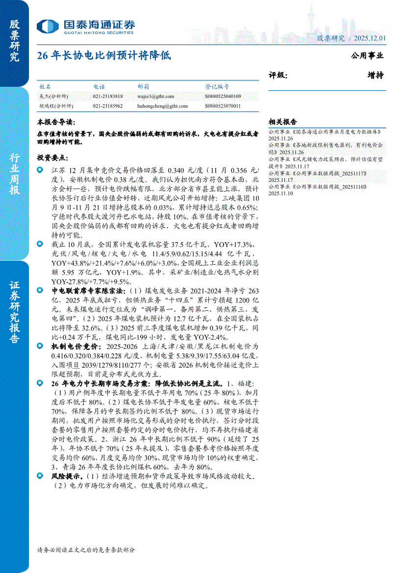公用事业行业:国泰海通证券-公用事业行业周报:26年长协电比例预计将降低-251201