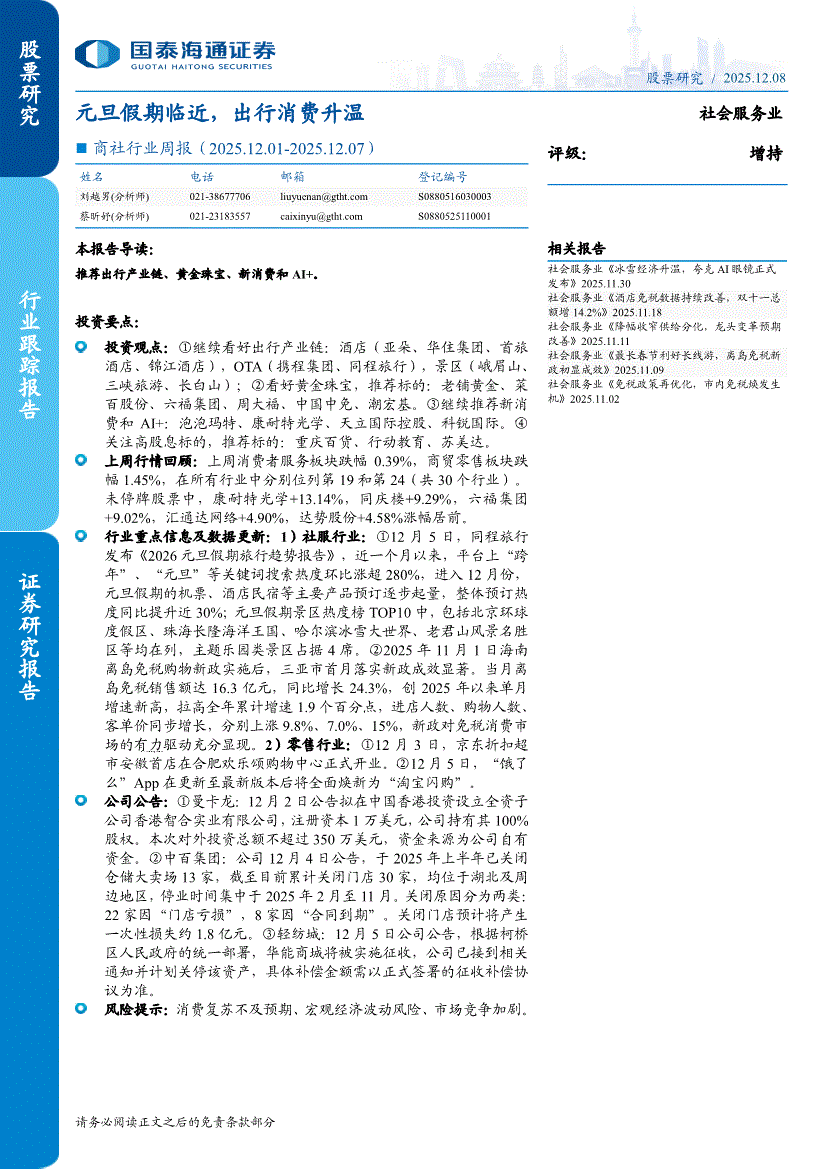 社会服务行业:国泰海通证券-商社行业周报:元旦假期临近,出行消费升温-251208