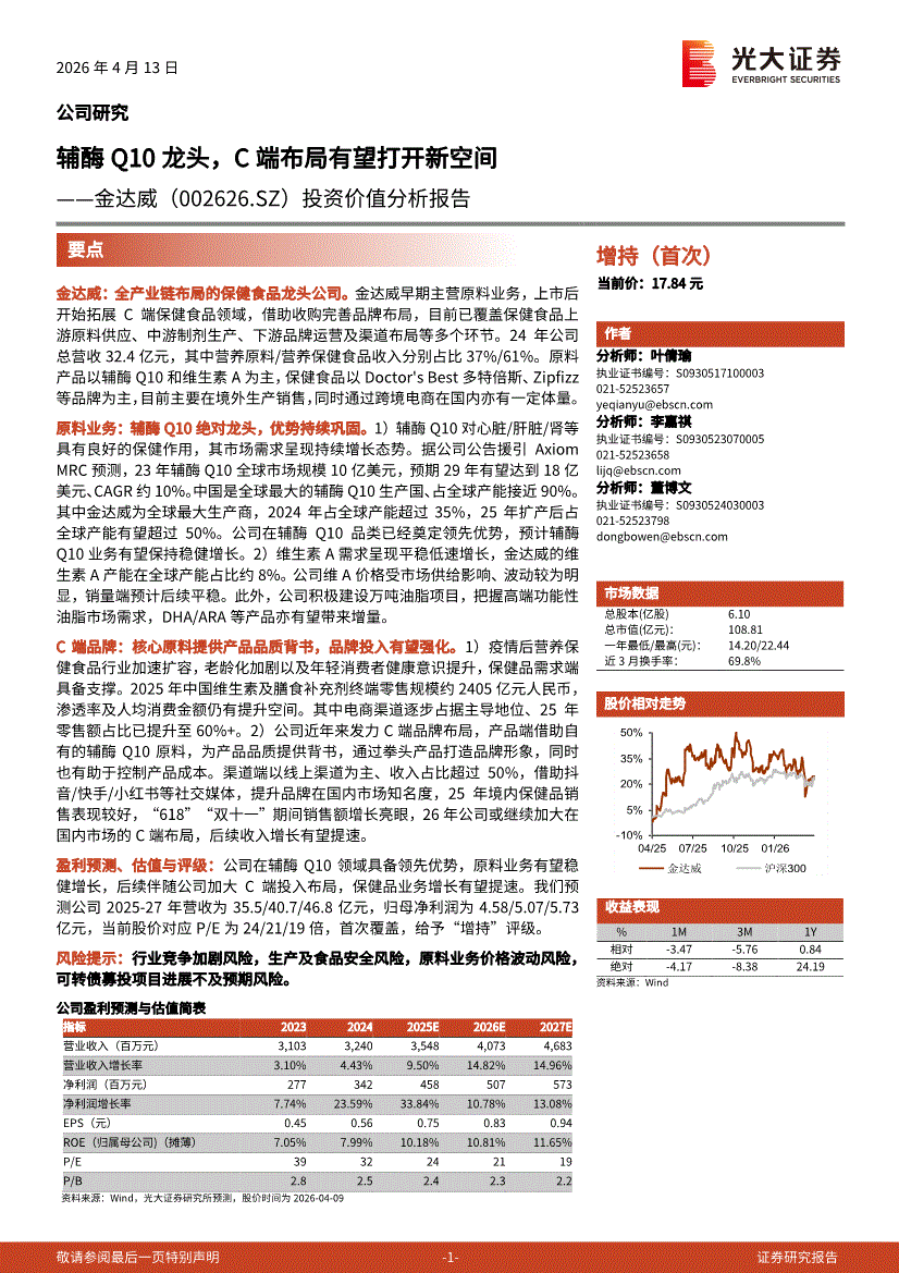 金达威:光大证券-金达威-002626-投资价值分析报告:辅酶Q10龙头,C端布局有望打开新空间-260413