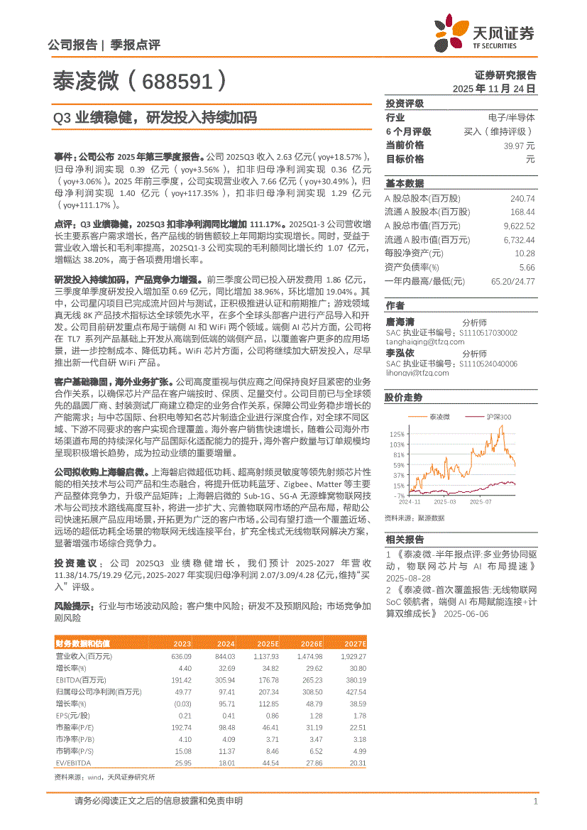 泰凌微:天风证券-泰凌微-688591-Q3业绩稳健,研发投入持续加码-251124