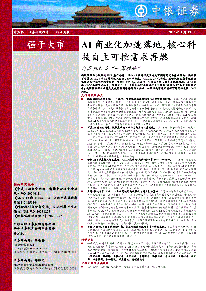 计算机行业:中银国际-计算机行业“一周解码”:AI商业化加速落地,核心科技自主可控需求再燃-260119