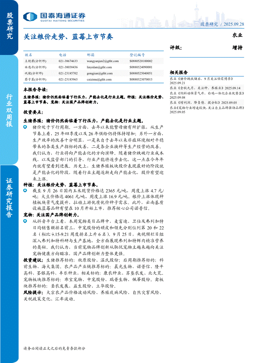 农业:国泰海通证券-农业双周报:关注粮价走势、蓝莓上市节奏-250928