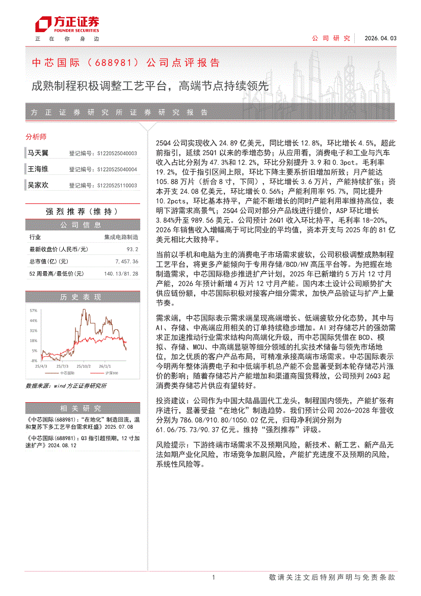 中芯国际:方正证券-中芯国际-688981-公司点评报告:成熟制程积极调整工艺平台,高端节点持续领先-260403