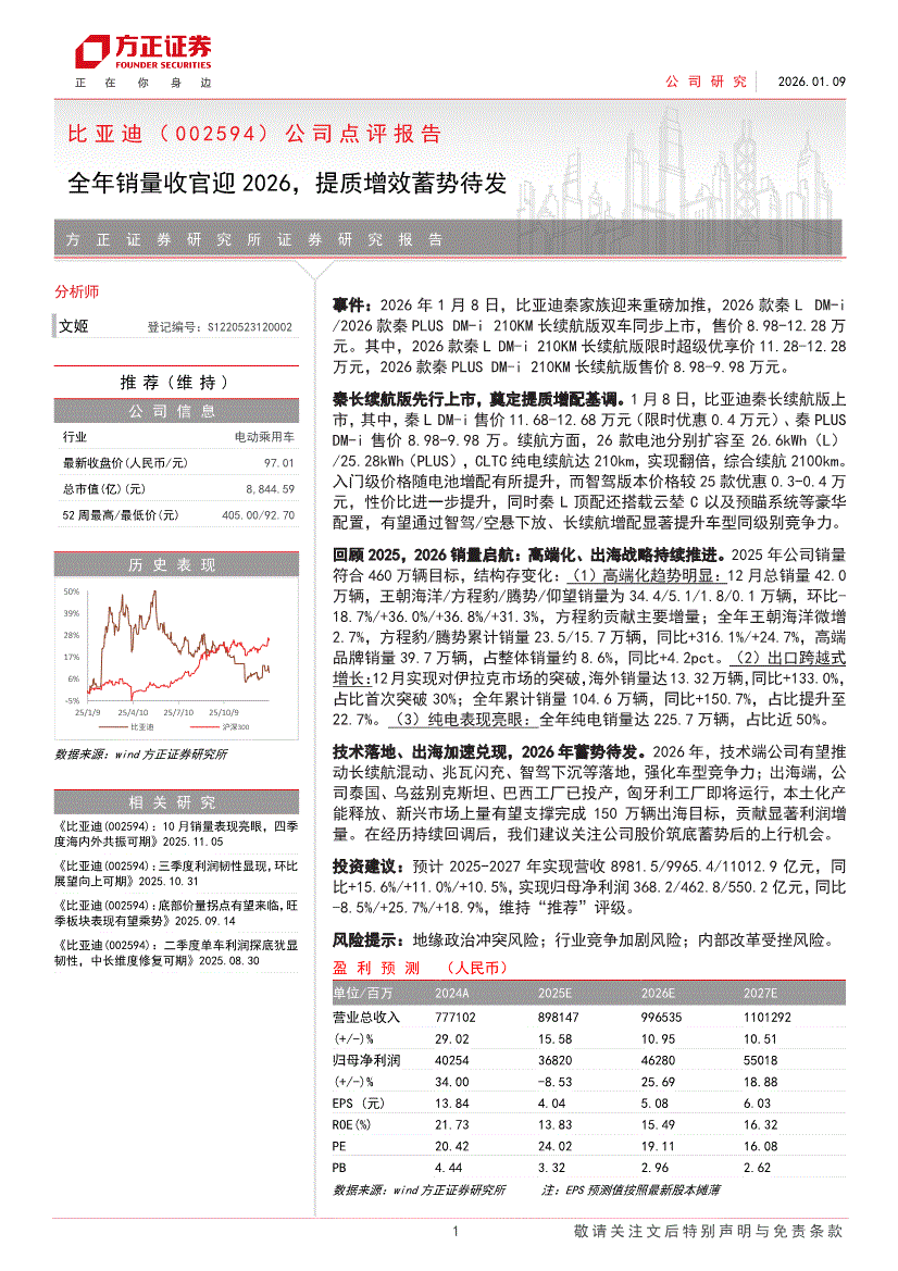 比亚迪:方正证券-比亚迪-002594-公司点评报告:全年销量收官迎2026,提质增效蓄势待发-260109