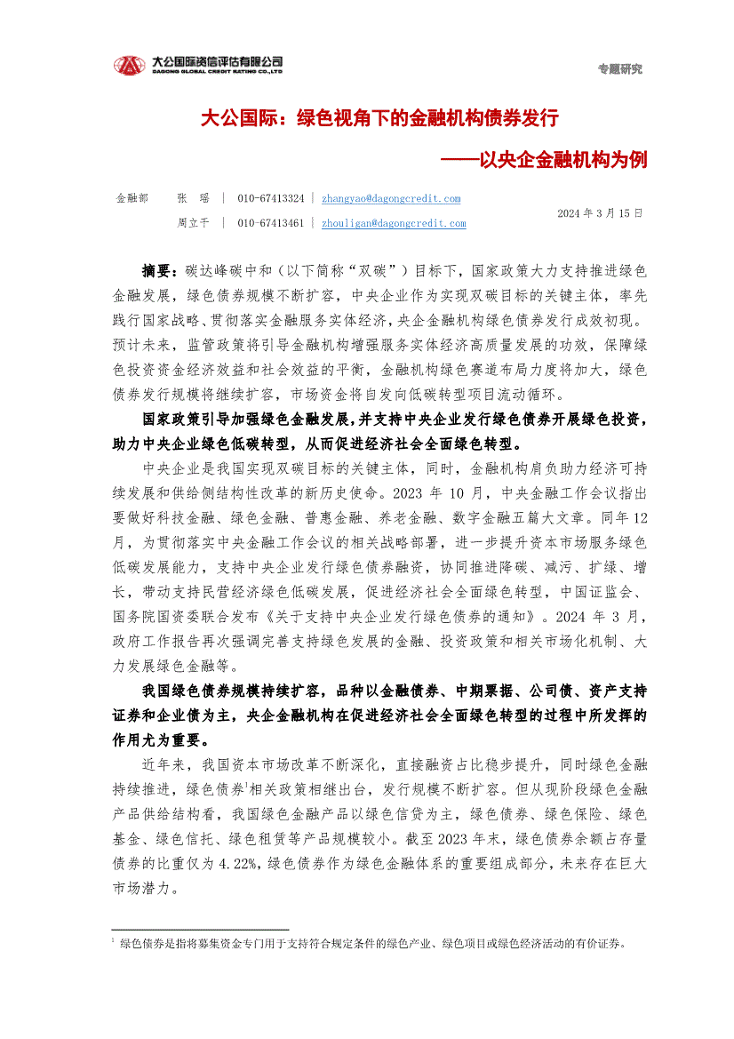 大公国际-绿色视角下的金融机构债券发行,以央企金融机构为例-240315