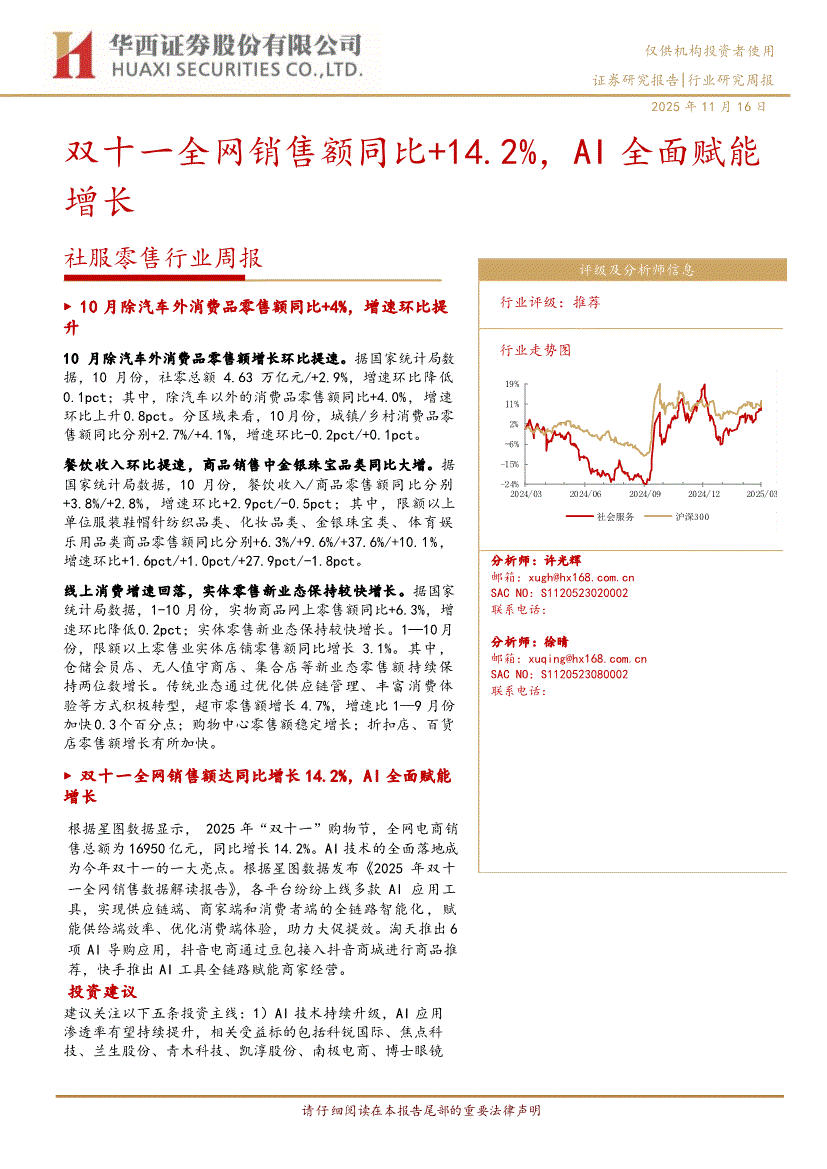 社服零售行业:华西证券-社服零售行业周报:双十一全网销售额同比+14.2%,AI全面赋能增长-251116