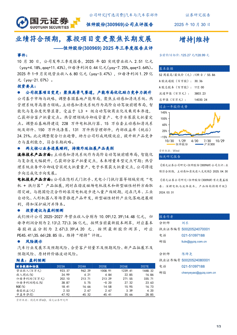 恒帅股份:国元证券-恒帅股份-300969-2025年三季度报告点评:业绩符合预期,募投项目变更聚焦长期发展-251030