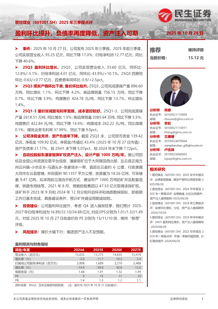 晋控煤业:民生证券-晋控煤业-601001-2025年三季报点评:盈利环比提升,负债率再度降低,资产注入可期-251028