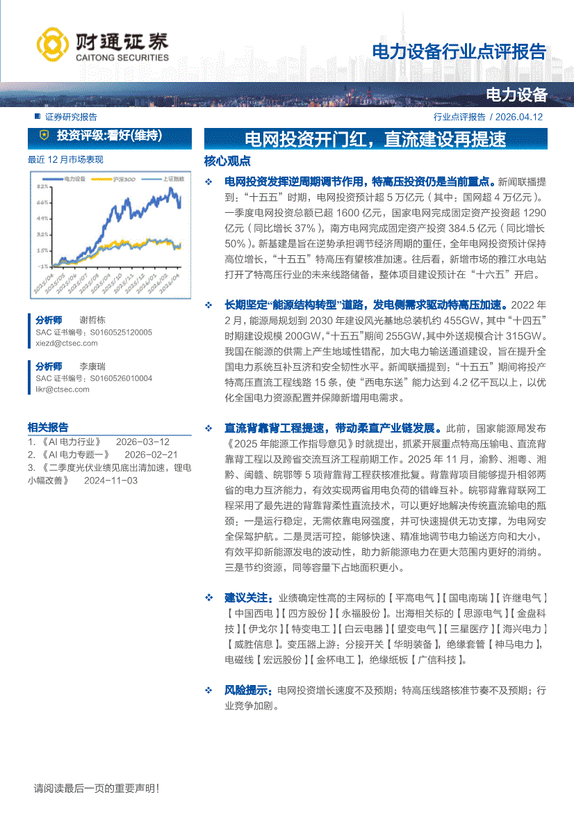 电力设备行业:财通证券-电力设备行业点评报告:电网投资开门红,直流建设再提速-260412