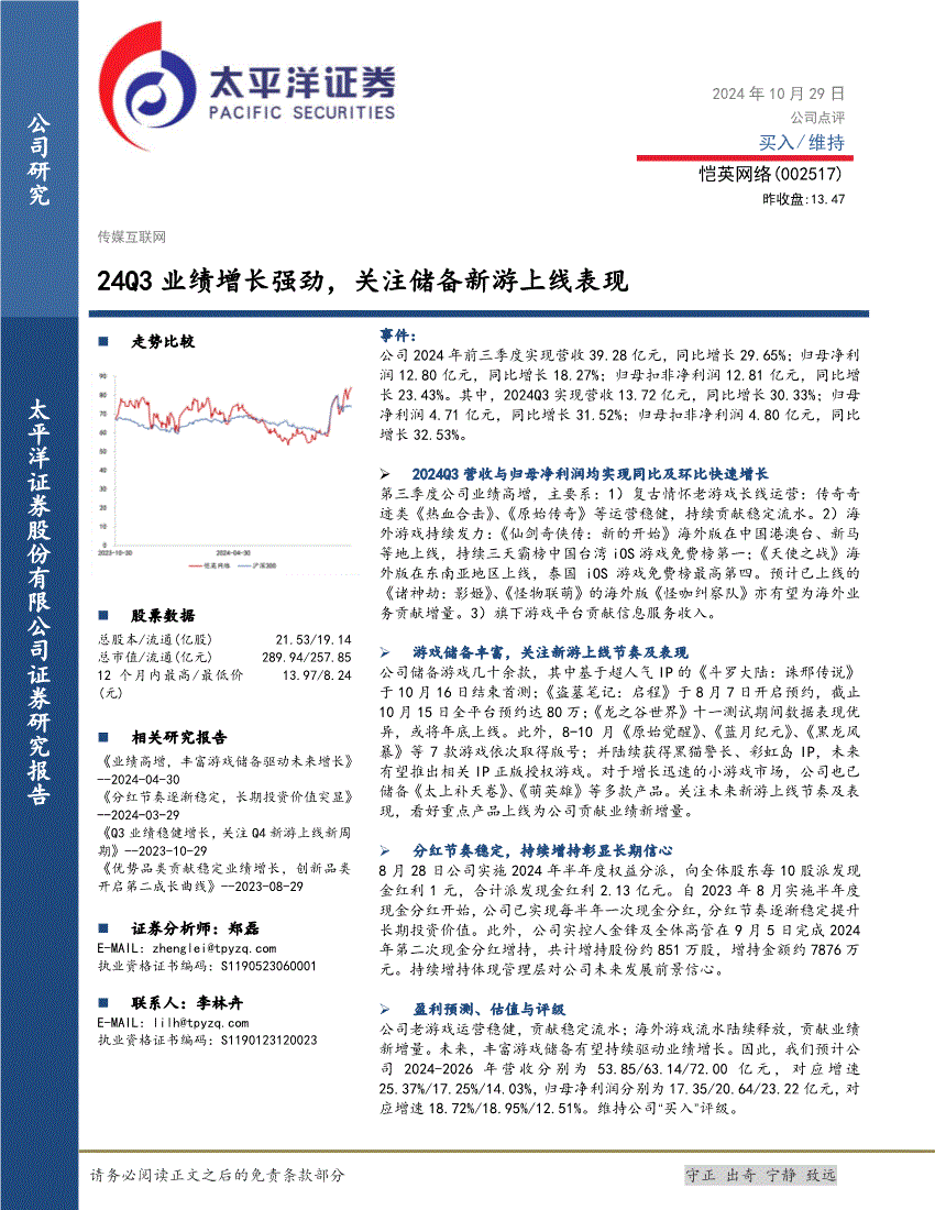 恺英网络:太平洋证券-恺英网络-002517-24Q3业绩增长强劲,关注储备新游上线表现-241029