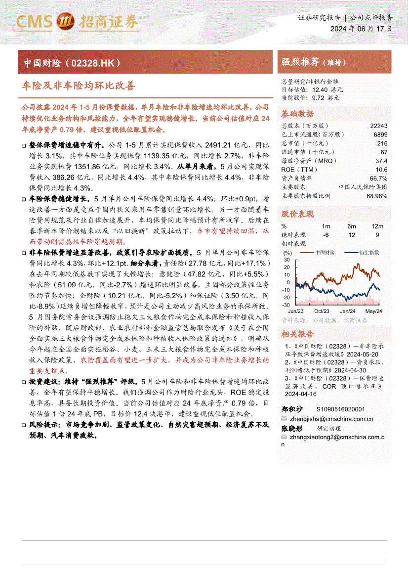 中国财险:招商证券-中国财险-2328.HK-车险及非车险均环比改善-240617