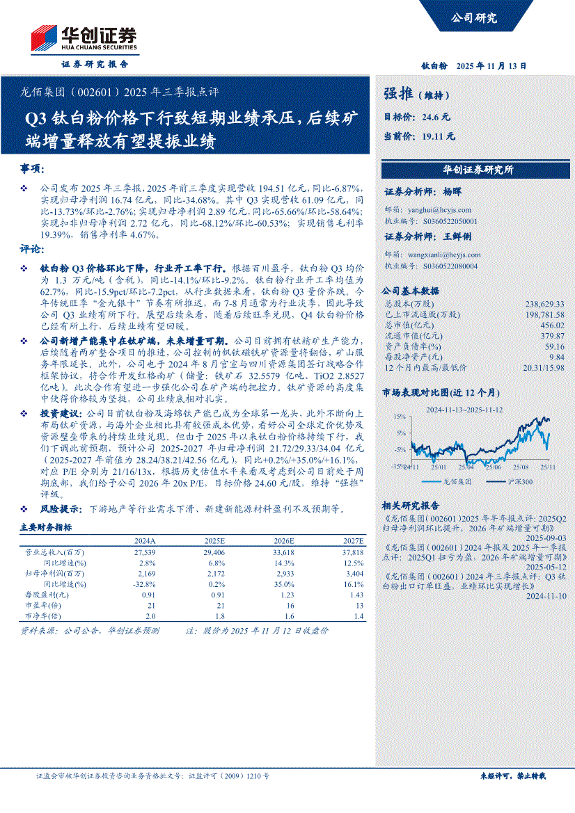 龙佰集团:华创证券-龙佰集团-002601-2025年三季报点评:Q3钛白粉价格下行致短期业绩承压,后续矿端增量释放有望提振业绩-251113