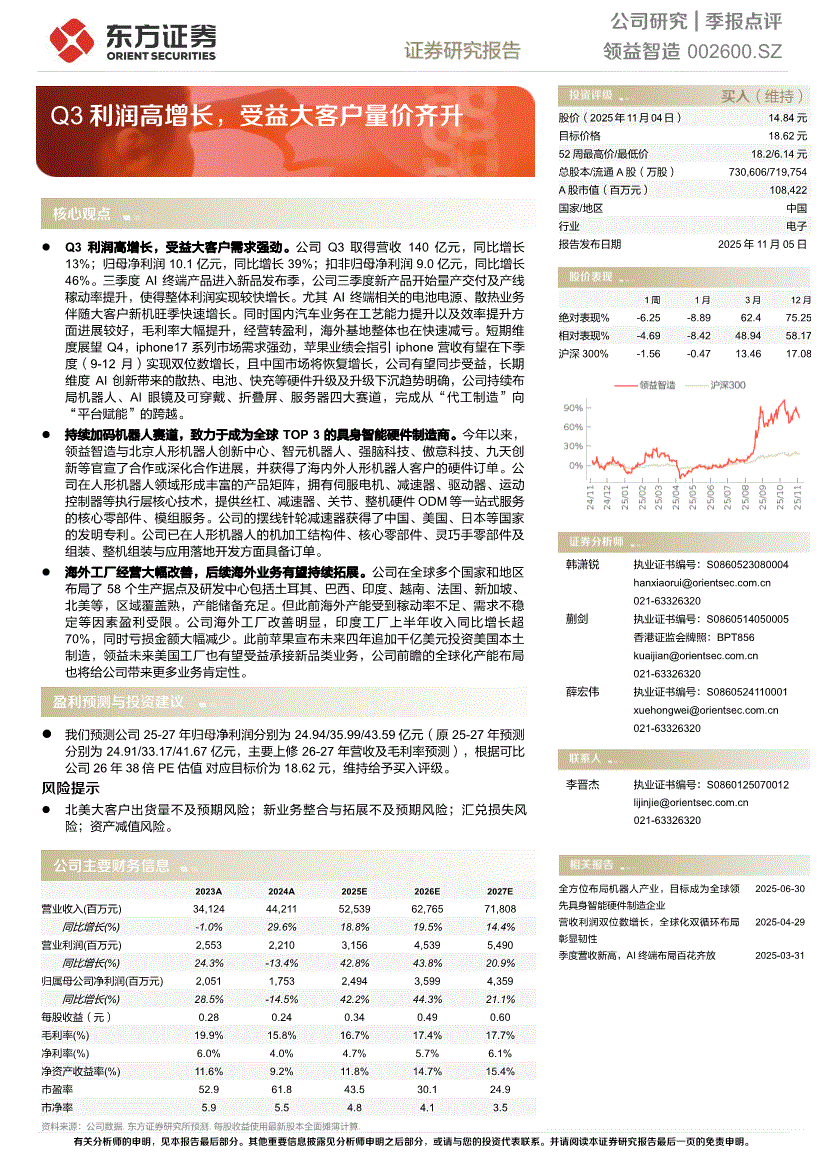 领益智造:东方证券-领益智造-002600-Q3利润高增长,受益大客户量价齐升-251105